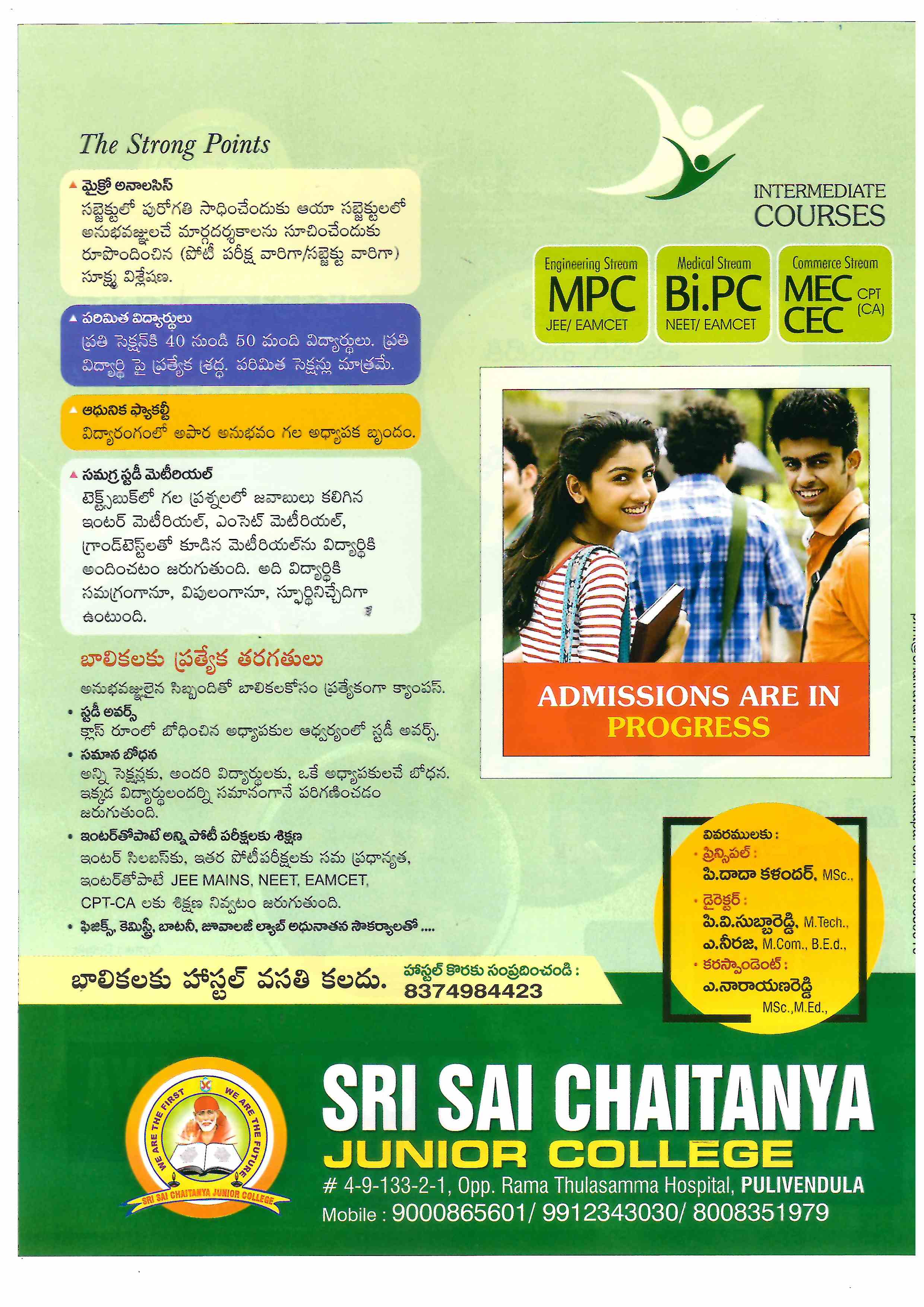 - For the past 21 Years, College has been providing valuable educational experiences. Established in March 2019, Sri Sai Chaitanya Junior College has quickly become a symbol of educational excellence. Learn about our mission and commitment to nurturing young minds in their academic journey.
